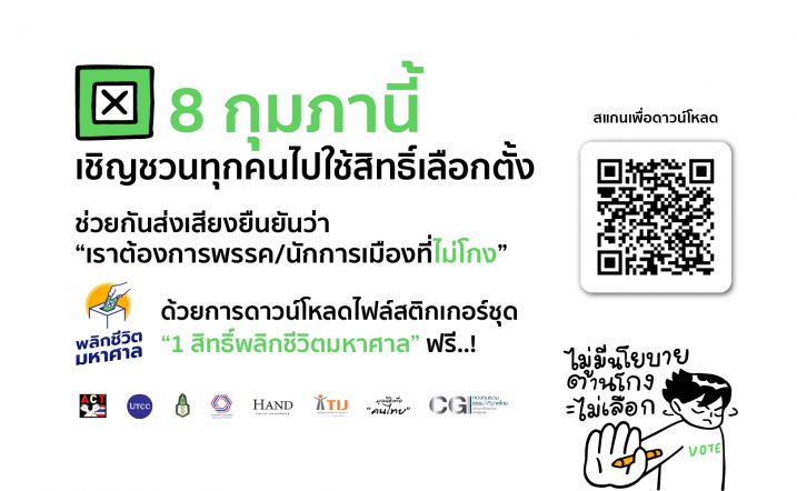 8 กุมภาพันธ์นี้ ขอเชิญชวนทุกคนไปใช้สิทธิ์เลือกตั้งกัน พร้อมช่วยกันส่งเสียงยืนยันว่า “เราต้องการพรรค / นักการเมืองที่ไม่โกง”