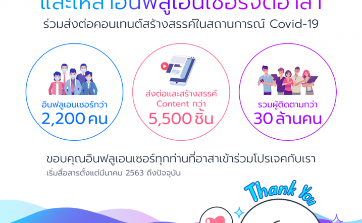 การระบาดของโควิด-19 สิ่งหนึ่งที่มักพบเห็นเสมอคือ “ธารน้ำใจ” ของคนไทยหลากหลายภาคส่วนที่ไม่ทอดทิ้งกัน เช่นเดียวกับ “บริษัท เทลสกอร์ จำกัด” นำทัพ “อินฟลูเอนเซอร์” ที่มีจิตอาสากว่า 2,200 คน สร้างสรรค์เนื้อหา Covid-19 รวมกว่า 5,500 ชิ้น มีผู้ติดตามมากกว่า 30 ล้านคนในระหว่างปลายเดือนมีนาคมถึงกลางเดือนพฤษภาคม 2563